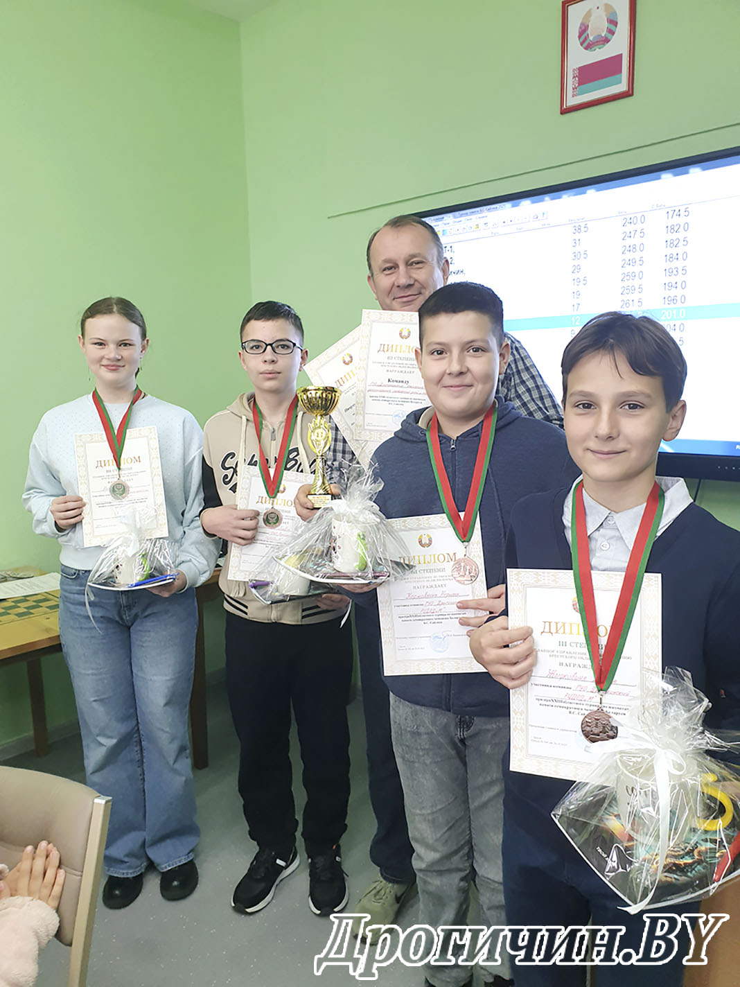 По итогам соревнований ГУО «Дрогичинский районный центр дополнительного образования детей и молодежи» занял третье место, пропустив вперед две команды хозяев турнира. Всего лишь 0.5 очка не хватило нашим спортсменам до второго места. Победители и призеры турнира награждены дипломами главного управления по образованию Брестского облисполкома, медалями, памятными сувенирами и кубком. За подготовку участников соревнований педагог дополнительного образования Анатолий Пицуха также награжден дипломом главного управления по образованию Брестского облисполкома. Поздравляем наших шахматистов, впереди их ждут обязательно новые Победы!