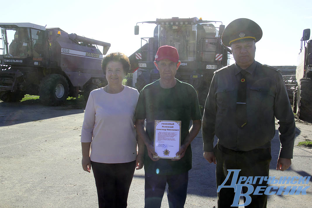 Механизаторов ОАО «Бездеж-Агро» Юрия Ельца и Александра Малиевского, сыновья которых проходят службу в Вооруженных Силах Республики Беларусь, поздравил военный комиссар района Олег Андрощук. Он отметил, что труд хлебороба всегда находится в центре внимания всего общества. Ведь с землей связаны не только судьбы отдельных людей, но и судьба нашей Родины. Он поблагодарил сельчан за воспитание сыновей, отметив, что их наследники защищают мирный труд своих отцов, которые обеспечивают продовольственную безопасность нашей страны. Так и получается, что отец за сына, а сын за отца.