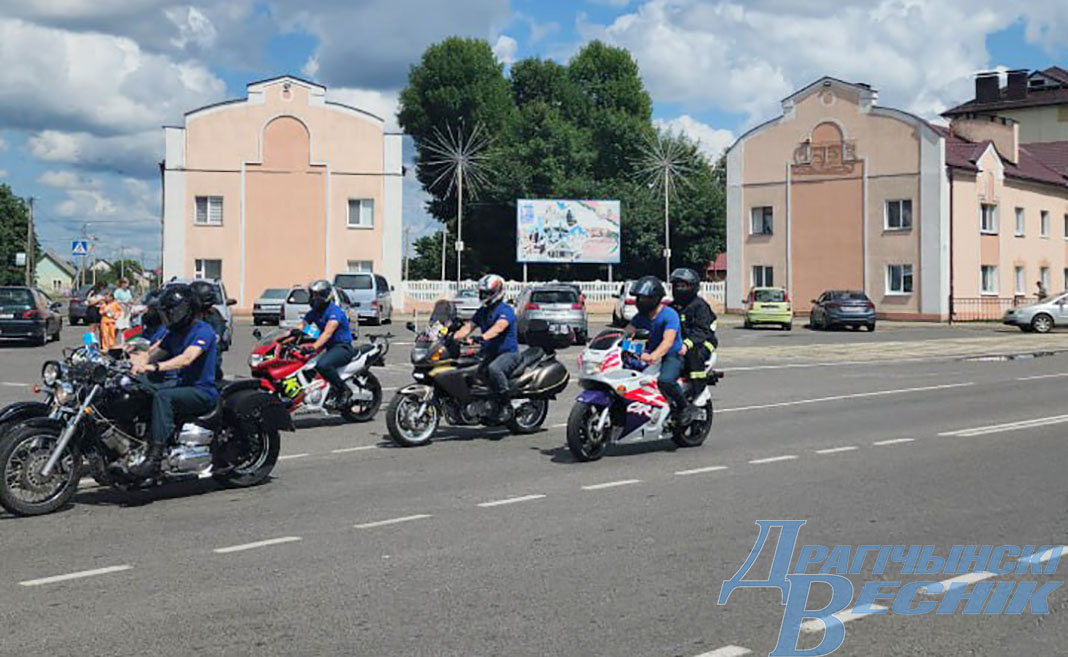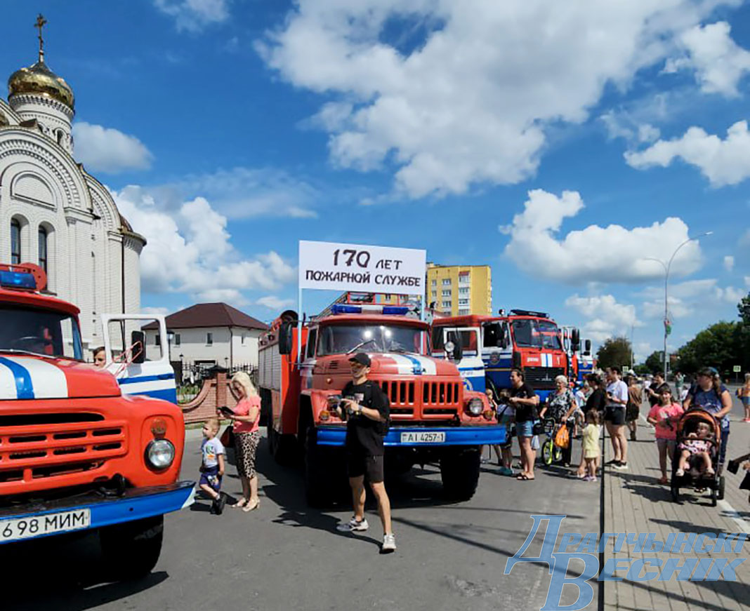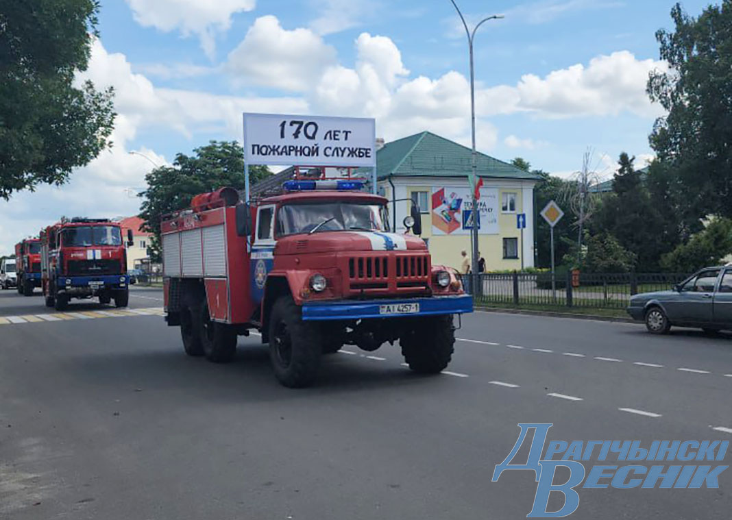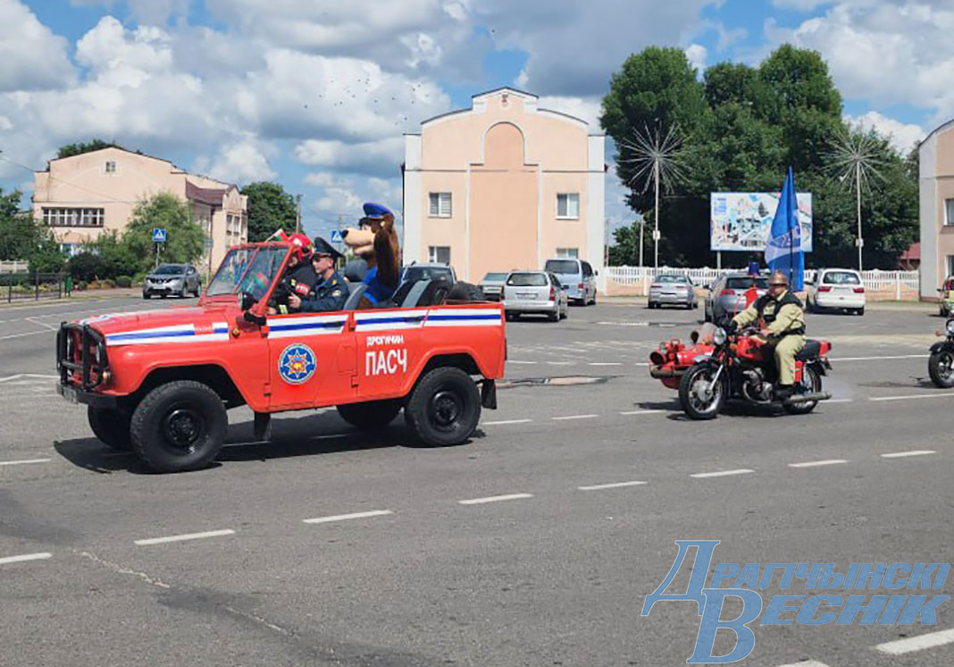 Сегодня строевым шагом по центральной улице города прошли пожарные Дрогичинского РОЧС. Следом за огнеборцами двигался мотоциклетный экипаж спасателей, пожарная техника советского периода и замыкали колонну современные машины, состоящие на вооружении в районной спасательной службе. Марш спасателей также сопровождал оркестр Дрогичинской детской школы искусств.