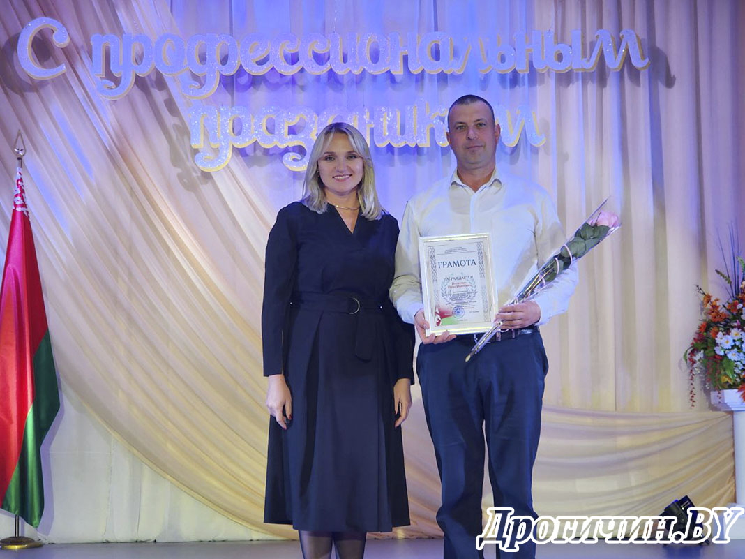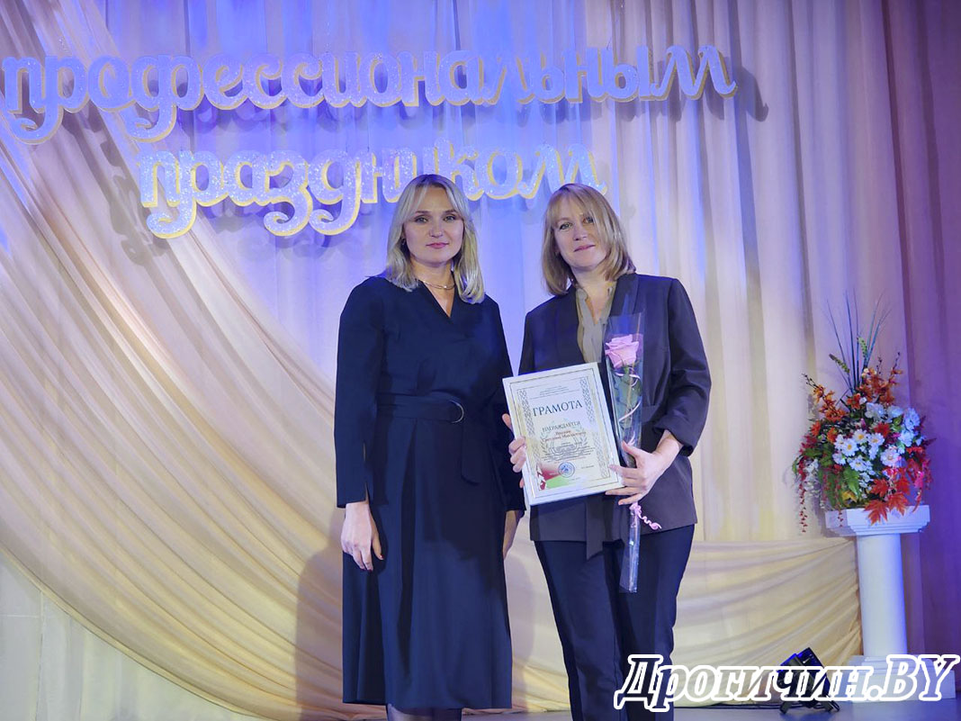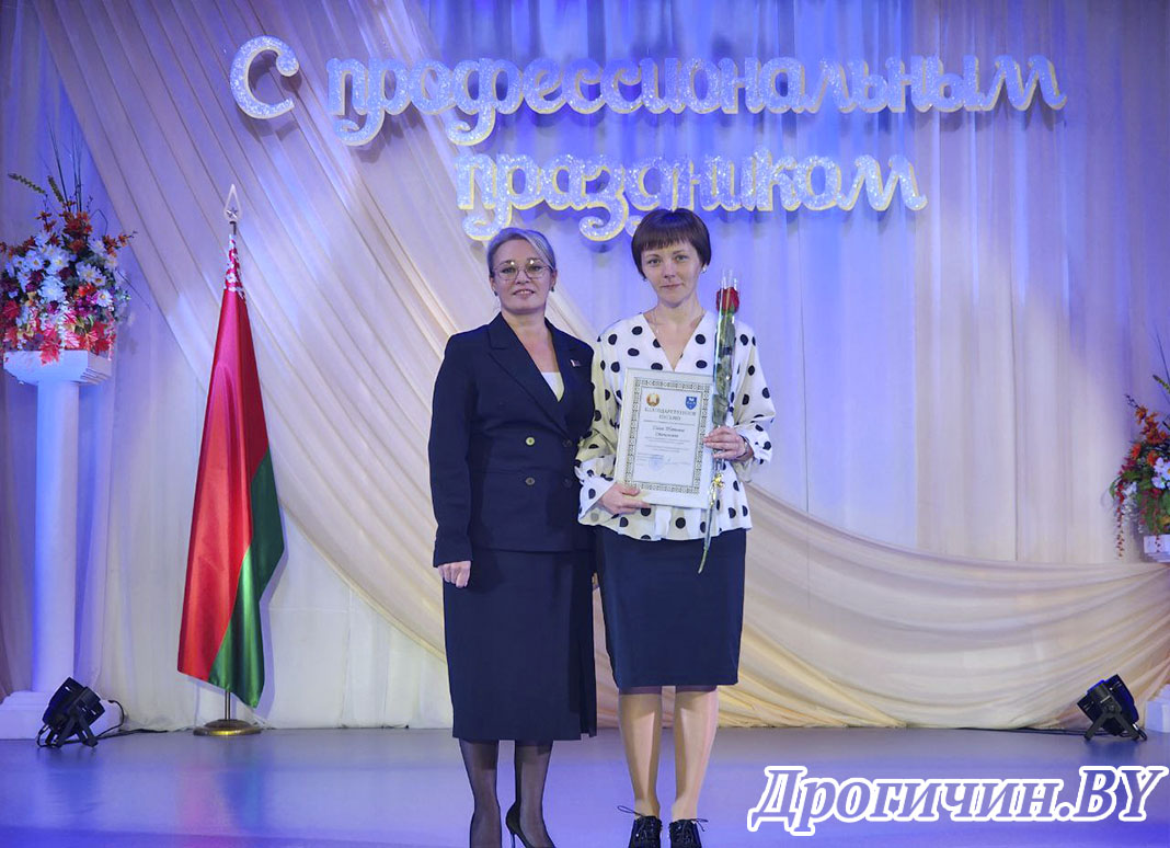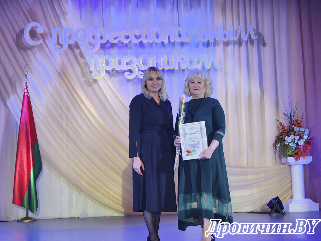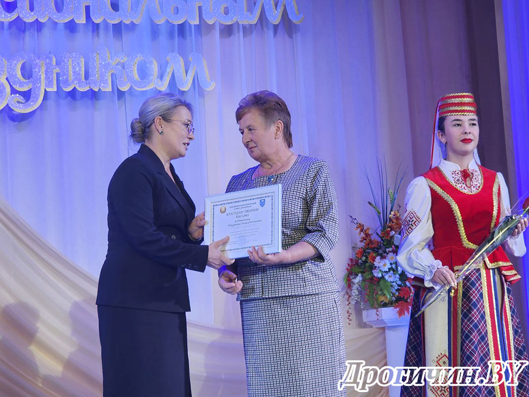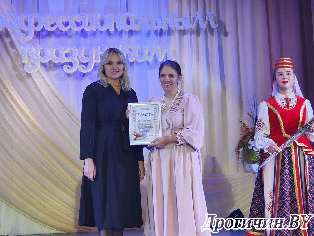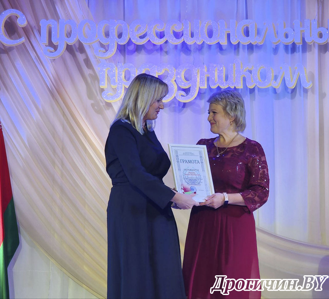 Поздравления продолжились выступлением председателя районной организации Белорусского профсоюза работников культуры, информации, спорта и туризма Марины Володкевич. Марина Павловна вручила профсоюзные грамоты методистам, учителям, заведующим клубами и представителям школ искусств. Ценный подарок от общественной организации «Белорусский республиканский союз молодежи» был также передан Полине Переход – учителю Дрогичинской детской школы искусств.