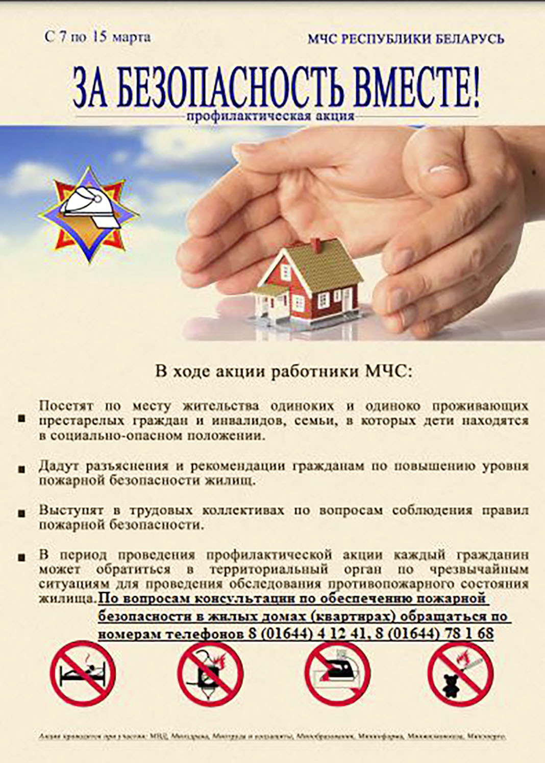 По вопросам консультации по обеспечению пожарной безопасности в жилых домах (квартирах) обращаться по номерам телефонов: 8 (01644) 4 12 41, 8 (01644) 78 1 68.